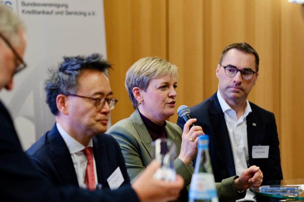 Zwei Jahre nach Inkrafttreten des Kreditdienstleisterrichtlinie-Umsetzungsgesetzes (KrZwMG) zogen die Panelisten eine erste Bilanz. Philipp Thurmann (PwC) und Dr. Thomas Dohrn (BMF) lieferten die Impulse, bevor Boris Rickmann (Deutsche Bank) und Dr. Michael Jung (Intrum) die praktischen Erfahrungen aus der Branche einbrachten.