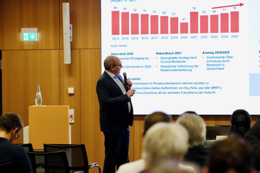 Rüdiger Rass, Bereichsvorstand Credit Risk bei der Commerzbank, sprach über die Herausforderungen der Risikosteuerung in einem von Volatilität geprägten Marktumfeld. Sein Vortrag zeigte, wie Banken ihre Strategien anpassen, um in unsicheren Zeiten handlungsfähig zu bleiben.